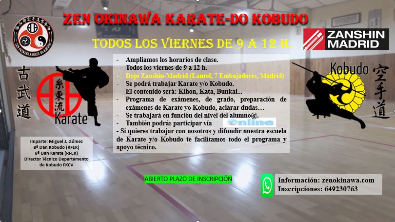Estimados compañeros, os informamos que hemos ampliado el horario de Karate-Do los viernes, que pasa a ser de 9 a 12 horas. En este horario se podrá trabajar indistintamente Karate o Kobudo.